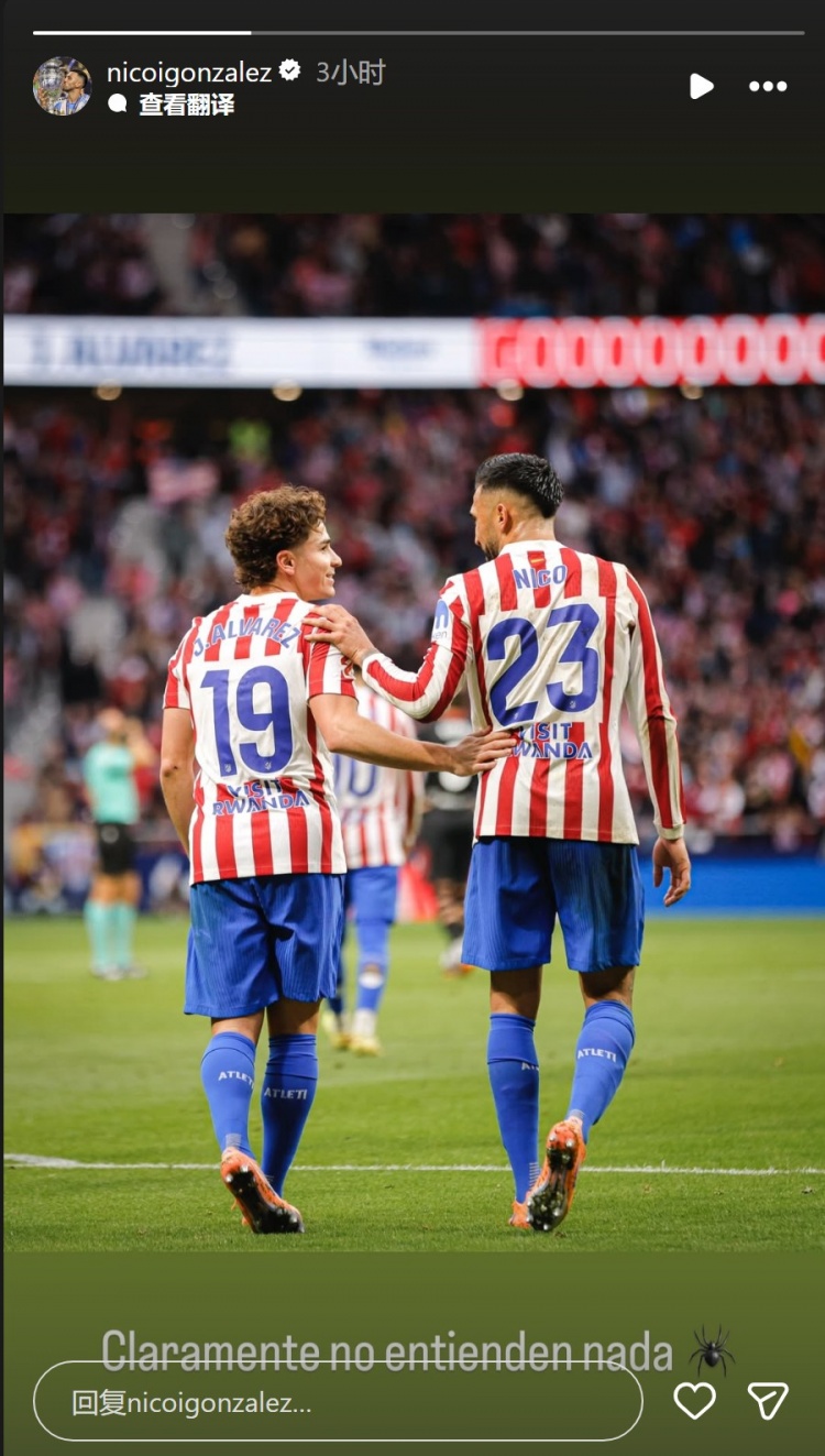 冈萨雷斯社媒晒出与阿尔瓦雷斯的合照,配文:“他们赫然什么齐不懂。”