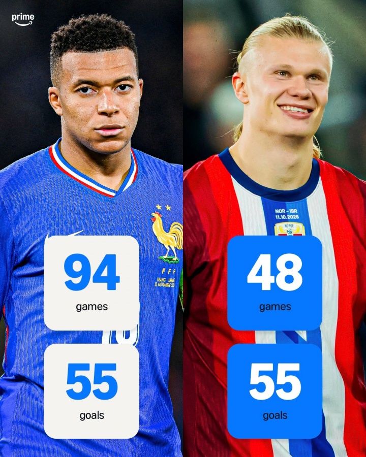 哈兰德与姆巴佩的国度队进球数雷同,但姆巴佩所用场次为94场,哈兰德场次仅为姆巴佩的一半多小数。