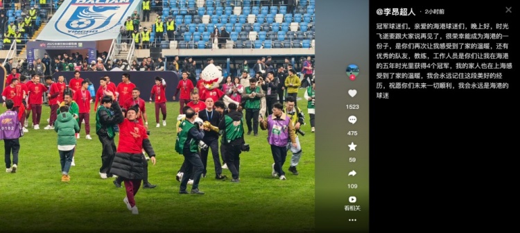 李昂在个东说念主微博写说念:冠军球迷们。亲爱的海港球迷们,晚上好,时光飞逝要跟环球说相遇了,很交运能成为海港的一份子,是你们再次让我感受到了家的温柔,还有优秀的队友,考验,使命主说念主员是你们让我在海港的五年时光里得到4个冠军,我的家东说念主也在上海感受到了家的温柔,我会恒久记着这段好意思好的资格,道贺你们将来一切凯旋,我会恒久是海港的球迷。