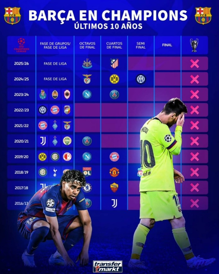4月15日讯 在欧冠出局 赛次局 ,巴萨2-1击败马竞,但是仍然遭到出局 。德转盘点了巴萨近10个赛季在欧冠战绩,最好成绩为两次进入准总决赛 。