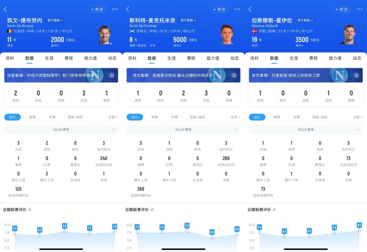 新赛季意甲,德布劳内3场2球、麦克托米奈3场1球、霍伊伦首秀破门,匡助卫冕冠军那不勒斯3连胜领跑意甲。