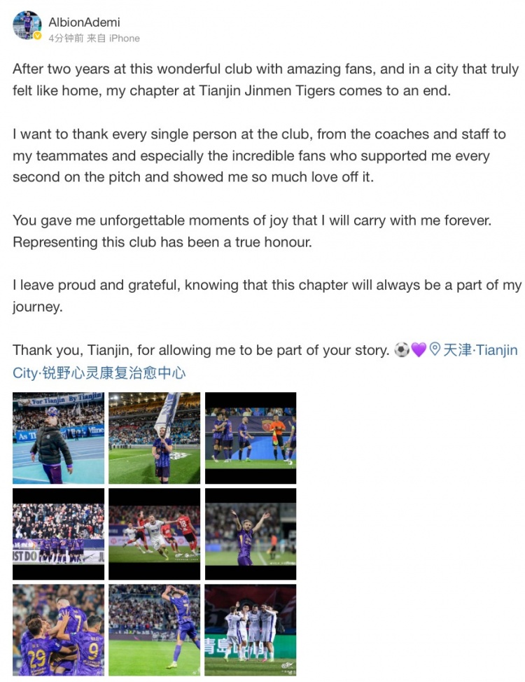 当天阿代米更新个东谈主微博,向天津球迷告别。他写谈: