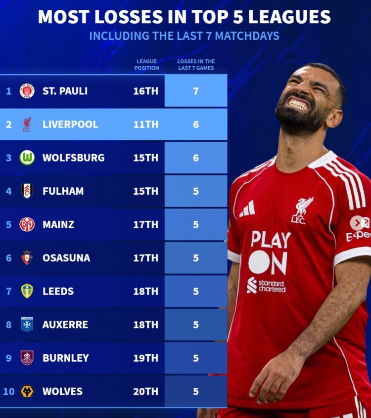 11月26日讯 利物浦在本轮英超主场0-3惨败诺丁汉丛林,连接了近期厄运弘扬,《转会市集》也统计了五大联赛近7轮输球最厚情况,利物浦位列次席。