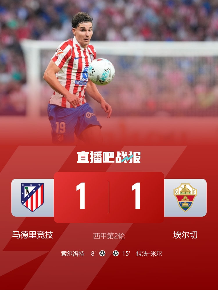 西甲第2轮,马竞1-1战平埃尔切,联赛前两轮1平1负。