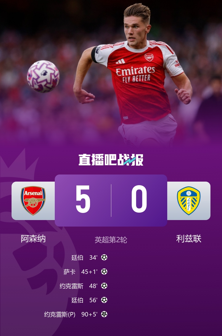 暂登顶!阿森纳5-0利兹联 约克雷斯双响廷伯2射1传萨卡破门+伤退