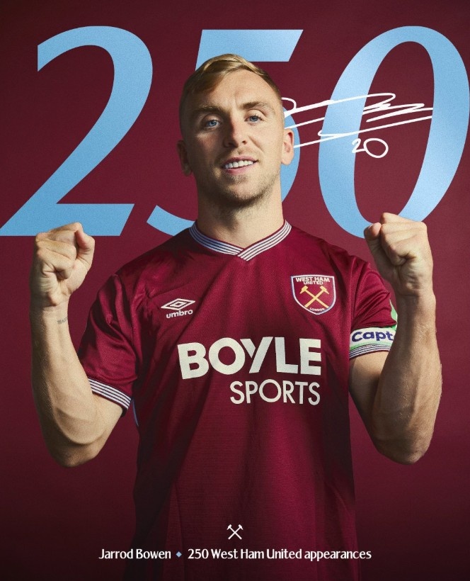11月8日讯 英超第11轮比赛,西汉姆联在主场迎战伯恩利。本场比赛,铁锤帮时尚鲍文首发出战,迎来我方在球队的250场里程碑之战。