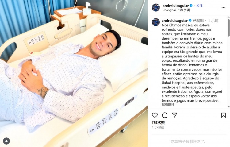随后,安德烈-路易斯发布社媒:“在最近几个月里,我一直遭逢严重的背部痛苦困扰,这适度了我的查验和比赛阐扬,也影响了往往家庭生涯。但匡助球队的渴慕如斯浓烈,甚至于让我高出了身体极限,最终导致严重的腰椎间盘凸起。咱们尝试了保守调治,但遵循欠安,因此决定禁受切除手术。感谢盛会海外病院团队的出色责任,包括照看、大夫和理疗师。现时我将启动康复经由,但愿能尽早转头查验和比赛。”