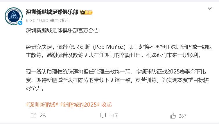 “穆尼奥斯又下课了!”当深圳新鹏城主场球迷的咆哮穿透夜空,当20分的积分榜名次像一把芒刃刺进统共东谈主的腹黑,这支中超新军终于在保级泥潭中作念出了最决绝的抉择。深圳新鹏城官方书记:主帅穆尼奥斯下课,助理教师陈涛火线接任代理主帅!俱乐部这样作念能否起死复活?