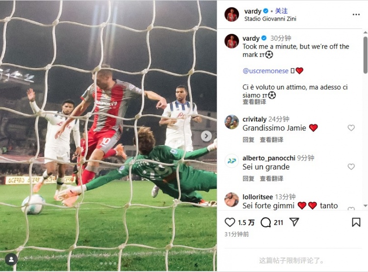 10月26日讯 瓦尔迪今天在Instagram发文,庆祝我方打入克雷莫内塞糊口首球。