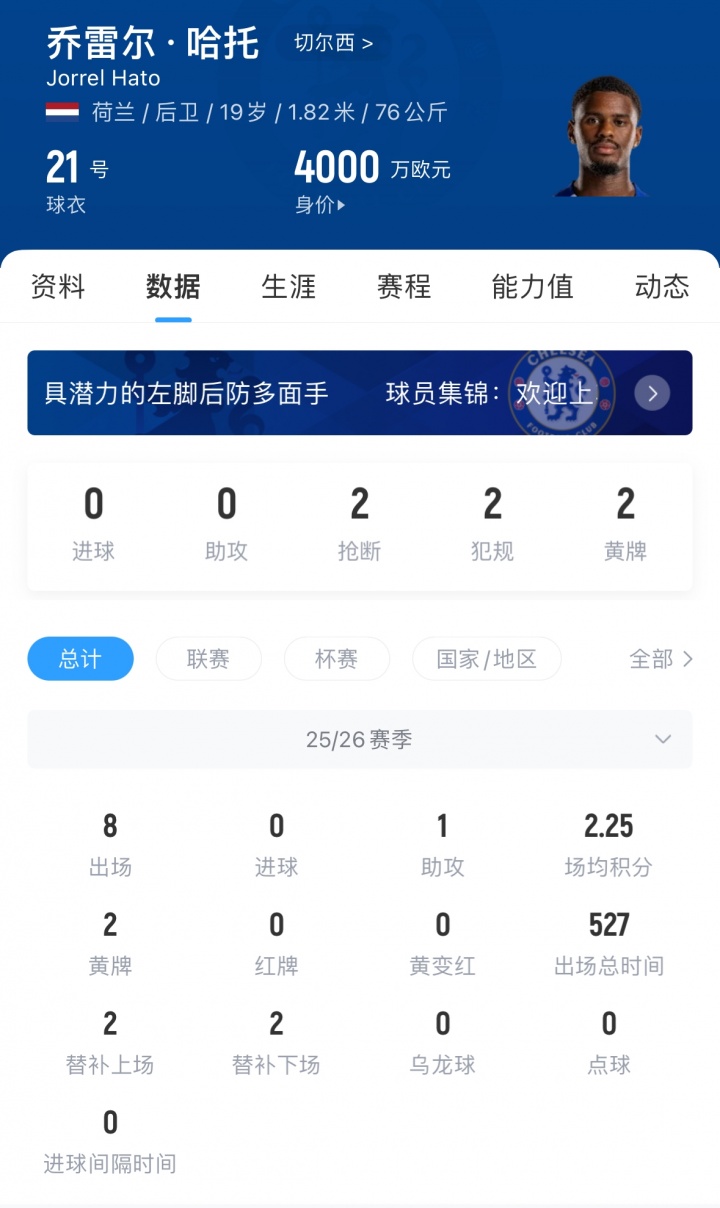 11月06日讯 欧冠联赛阶段第4轮,切尔西2-2战平阿塞拜疆球队卡拉巴赫,本场比赛,切尔西小将哈托阐扬晦气,失实耸立+送点,导致敌手贯穿打入两球。