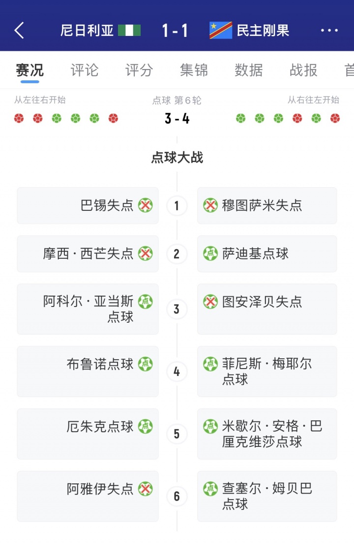 两队120分钟战成1-1,干预点球大战。尼日利亚1次点球射失,2次点球被扑,最相当球大战3-4不敌民主刚果。两队的门将推崇骁勇,永别完成两次扑点。