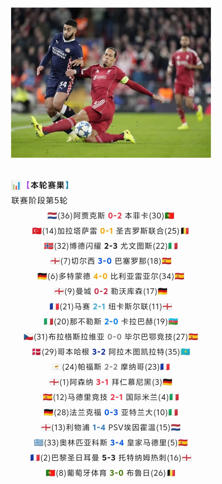 2025/26赛季欧冠战报-L5丨榜首大战阿森纳打败拜仁保抓全胜,榜尾大战阿贾克斯不敌本菲卡保抓全败