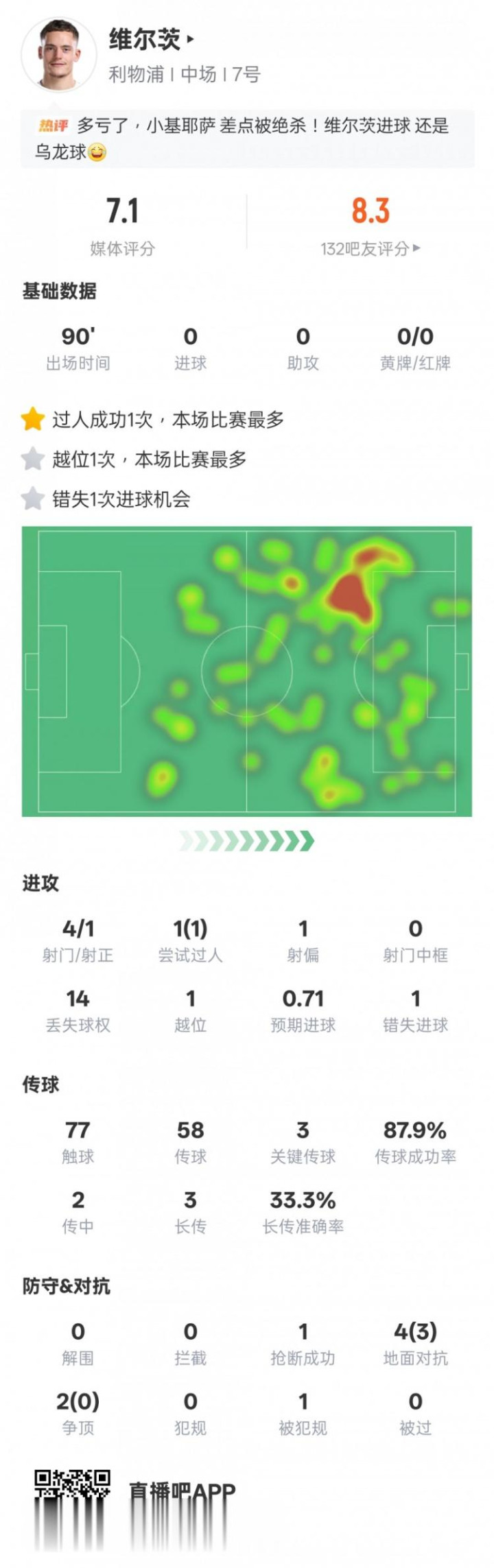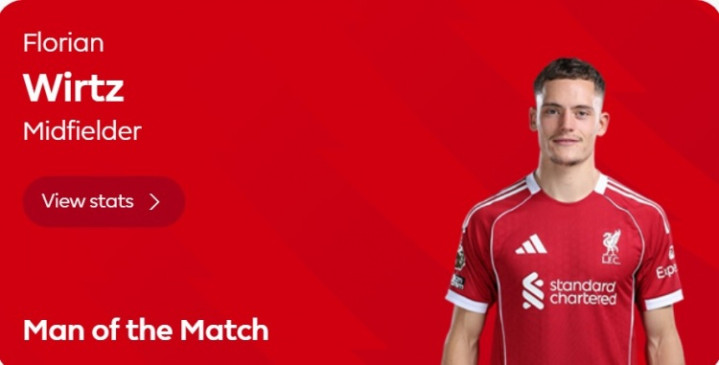 此役维尔茨踢满全场,并造穆基勒乌龙,为利物浦扳平比分,英超官方晓示,经由球迷的投票,维尔茨当选本场比赛最好球员。