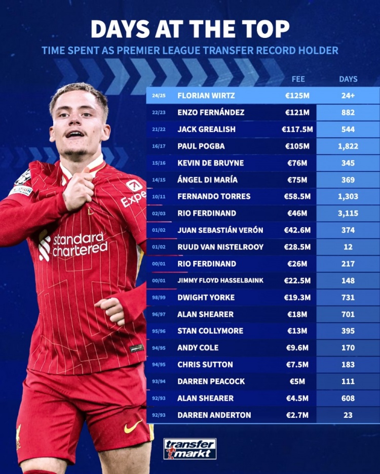 7月26日讯 德国转会阛阓列出了英超历史标王的保合手技艺,其中费迪南德4600万欧保合手3115天最长,当今的标王为维尔茨,他的转会费为1.25亿欧元。
