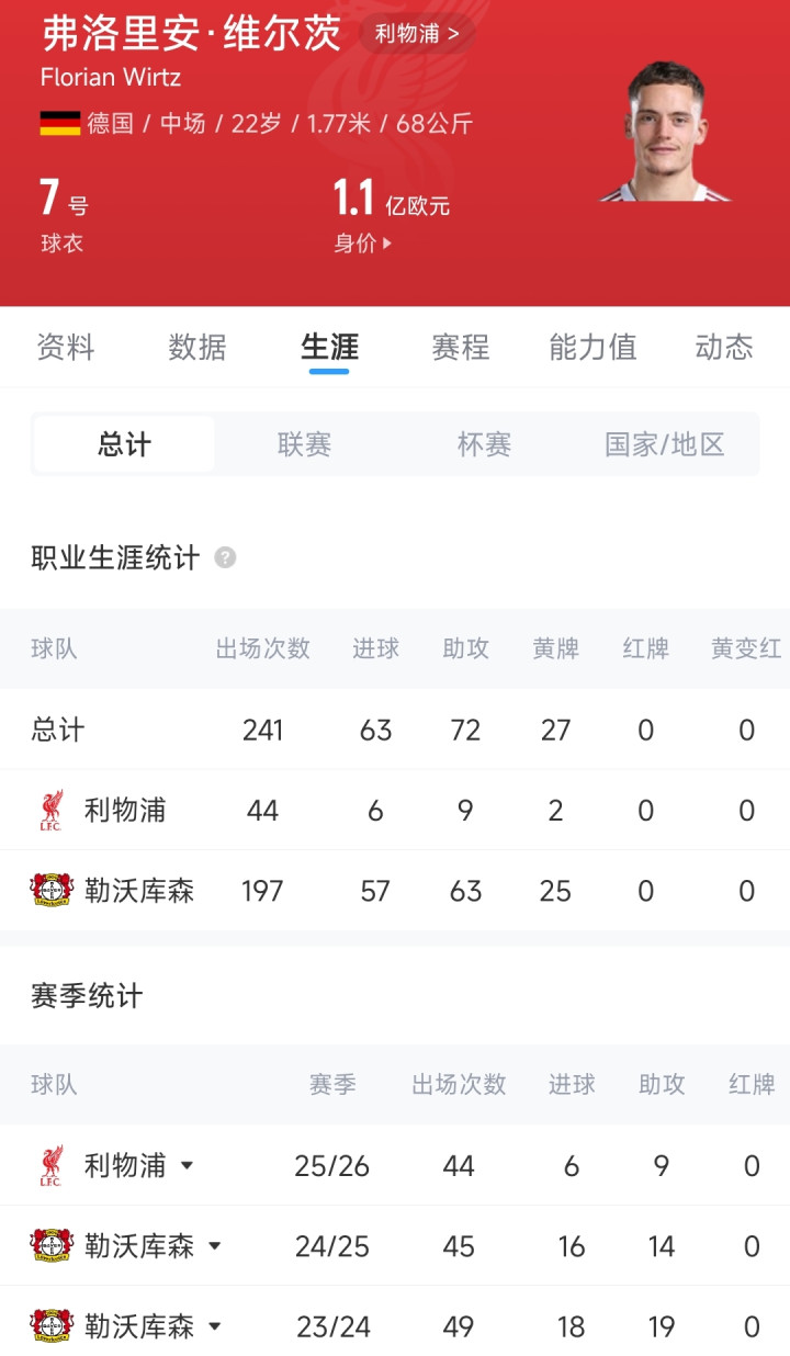 去年夏窗,维尔茨以1.25亿欧元的转会费,从勒沃库森加盟利物浦,但始终未能完全适应球队,本赛季出战44场赛事 ,只贡献6粒得分 和9次助功 ,数据较前两个赛季缩水近一半。