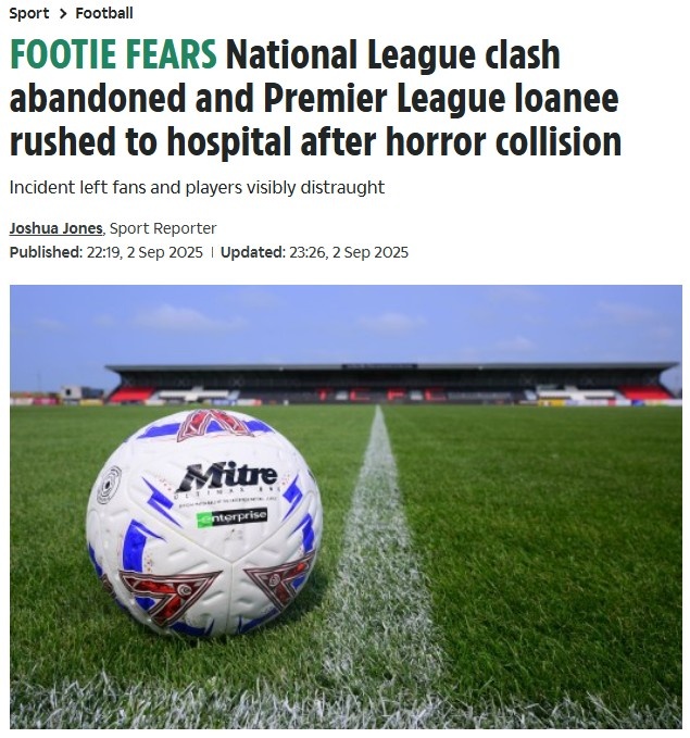 9月3日讯 《太阳报》报说念,英格兰寰球联赛(第五级别联赛)两名球员头部相撞,比赛凯旋被叫停。