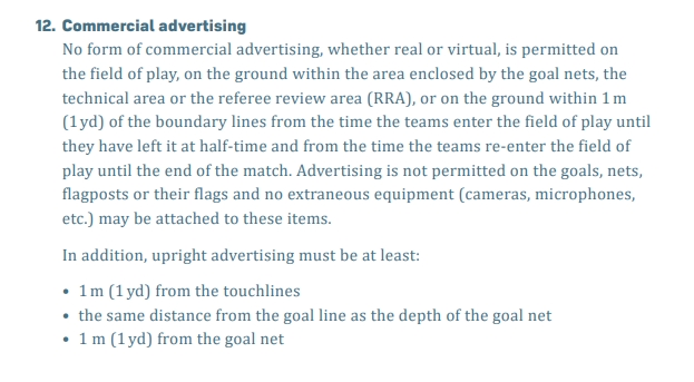 自球队入场起至上半场截止离场,以及自球队再次入场起至比赛全场截止时候,在比赛场面内、球网围挡区域内、本领区域、视频裁判操作区内,以及距场面规模线1米(1码)范畴内的大地上,均退却出现任何表情的交易告白(包括实体与编造告白)。球门、球网、角旗杆及旗面上亦不得建树告白,且这些标准上不得附着任何外围建造(如录像机、麦克风等)。