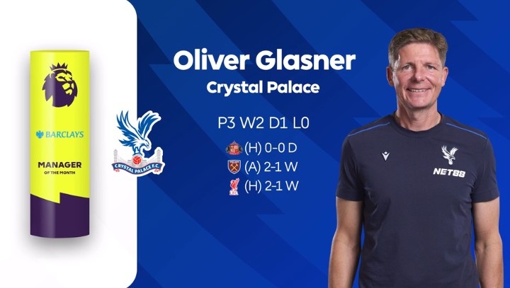 51岁的格拉斯纳(2024年2月上任)成为继2020年7月拉尔夫-哈森许特尔(南安普顿)后第二位获此盛誉的奥地利籍主帅,亦然自2014年4月托尼-普利斯后首位获奖的水晶宫主帅。