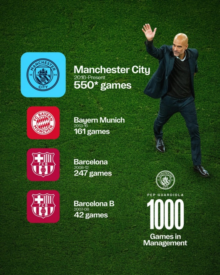 此役将是瓜迪奥拉合手教生存带队干涉的第1000场比赛,曼城官方社媒晒出瓜帅合手教场次的漫步。