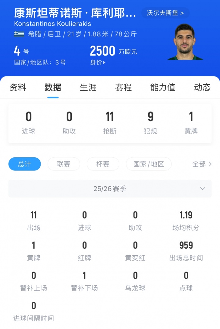 库利耶拉基斯现年21岁,是又名左脚中卫,他昨年夏天加盟沃尔夫斯堡,本赛季已为球队出场11次,现身价2500万欧。