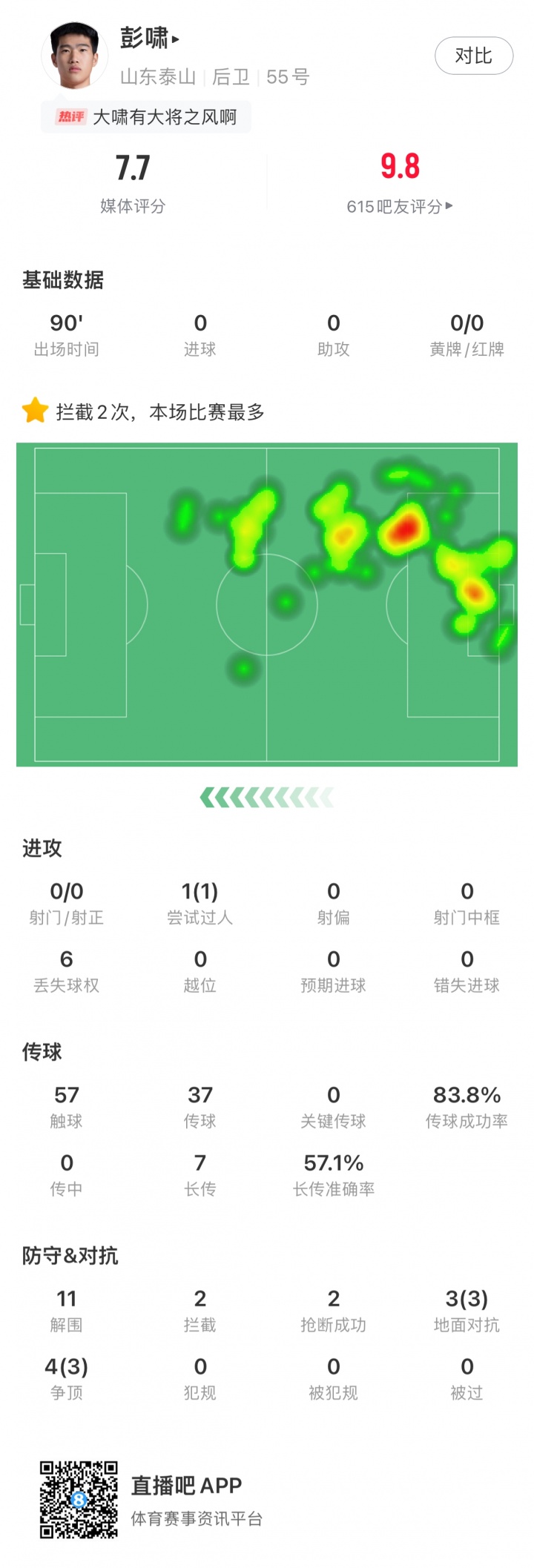 本场比赛,20岁的小将彭啸首发出场打满全场比赛,在三天前,他刚刚为国足U22首发出战对阵澳大利亚U23并打满全场。